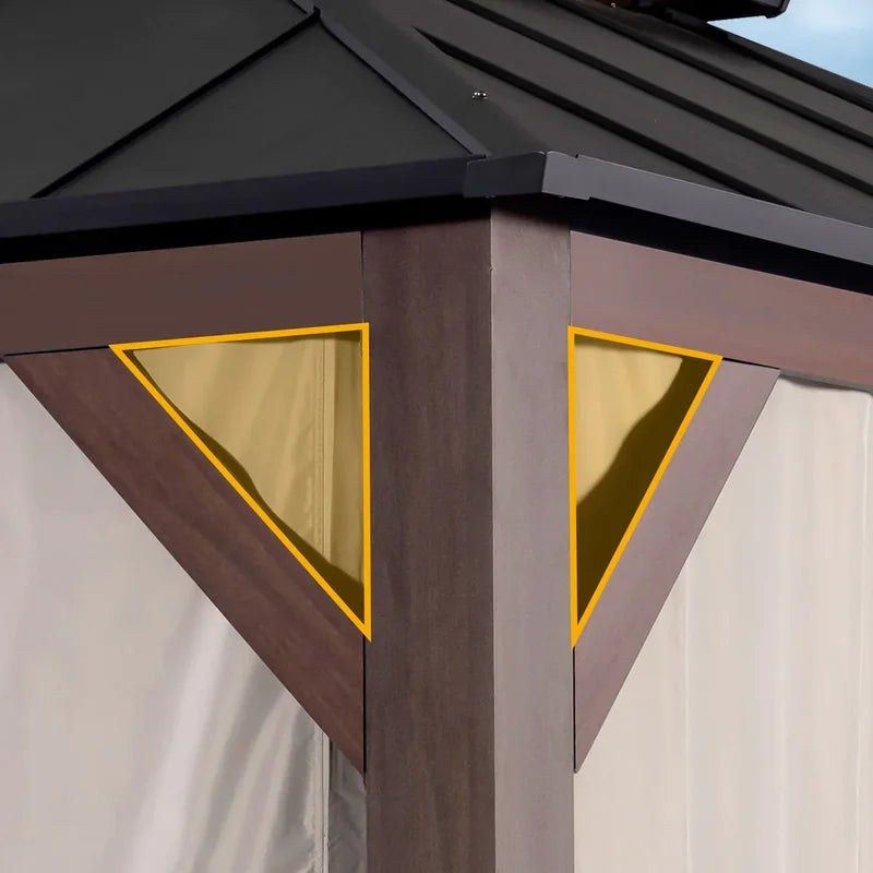 Reasonably sloped roof designed to allow water to drain quickly, and the water gutter design of this hardtop gazebo ensures rainwater flows out of the edges of the frame and poles.