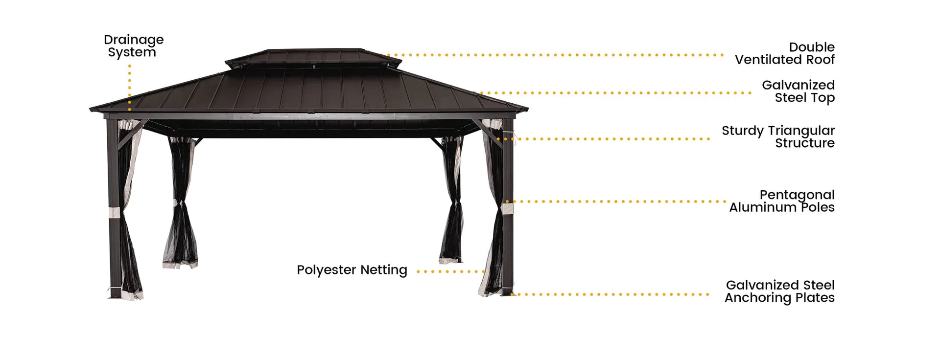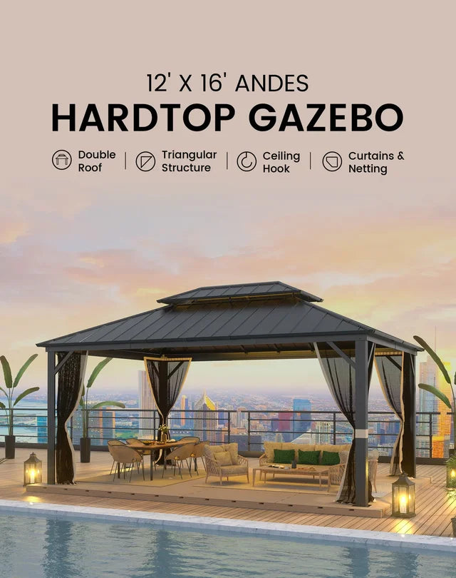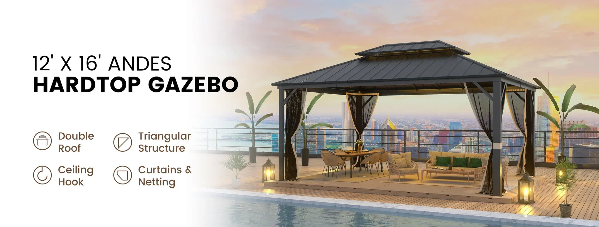 12' x 16' Andes Hardtop Gazebo with Double Roof & Netting